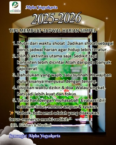 TIPS MEMBUAT JADWAL HARIAN SIMPEL ISLAMI Mulai dari waktu sholat Jadikan sholat sebagai poros jadwal harian agar hidup lebih teratur. Pilih 3 aktivitas utama saja Sedikit tapi konsisten lebih dicintai Allah daripada banyak tapi berat. Dahulukan yang wajib, lalu sunnah Kewajiban dulu, sis [...]