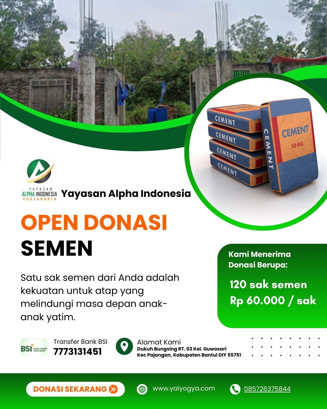 Kami mengajak Bapak/Ibu dan Sahabat Dermawan untuk berpartisipasi dalam program OPEN DONASI SEMEN ini. Tidak harus banyak, karena 1 sak semen pun sangat berarti bagi keberlangsungan pembangunan asrama yatim.