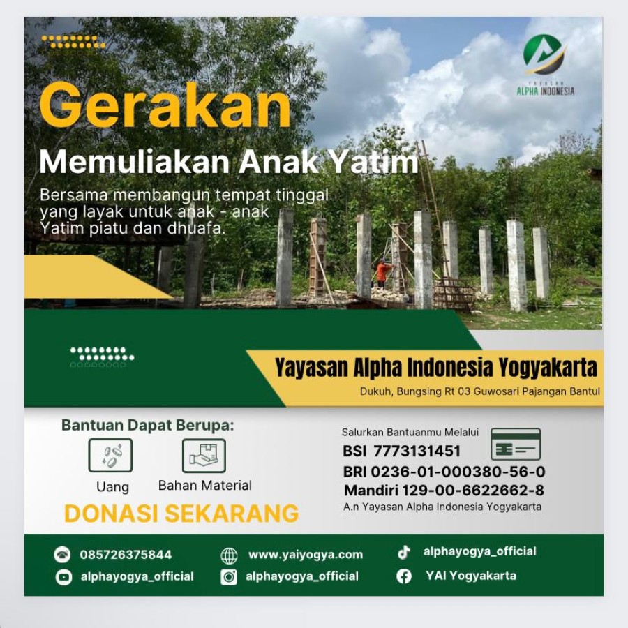 Dalam rangka memenuhi kebutuhan kamar sebagai sarana untuk mukim anak- anak yatim binaan Yayasan Alpha Indonesia Yogyakarta.